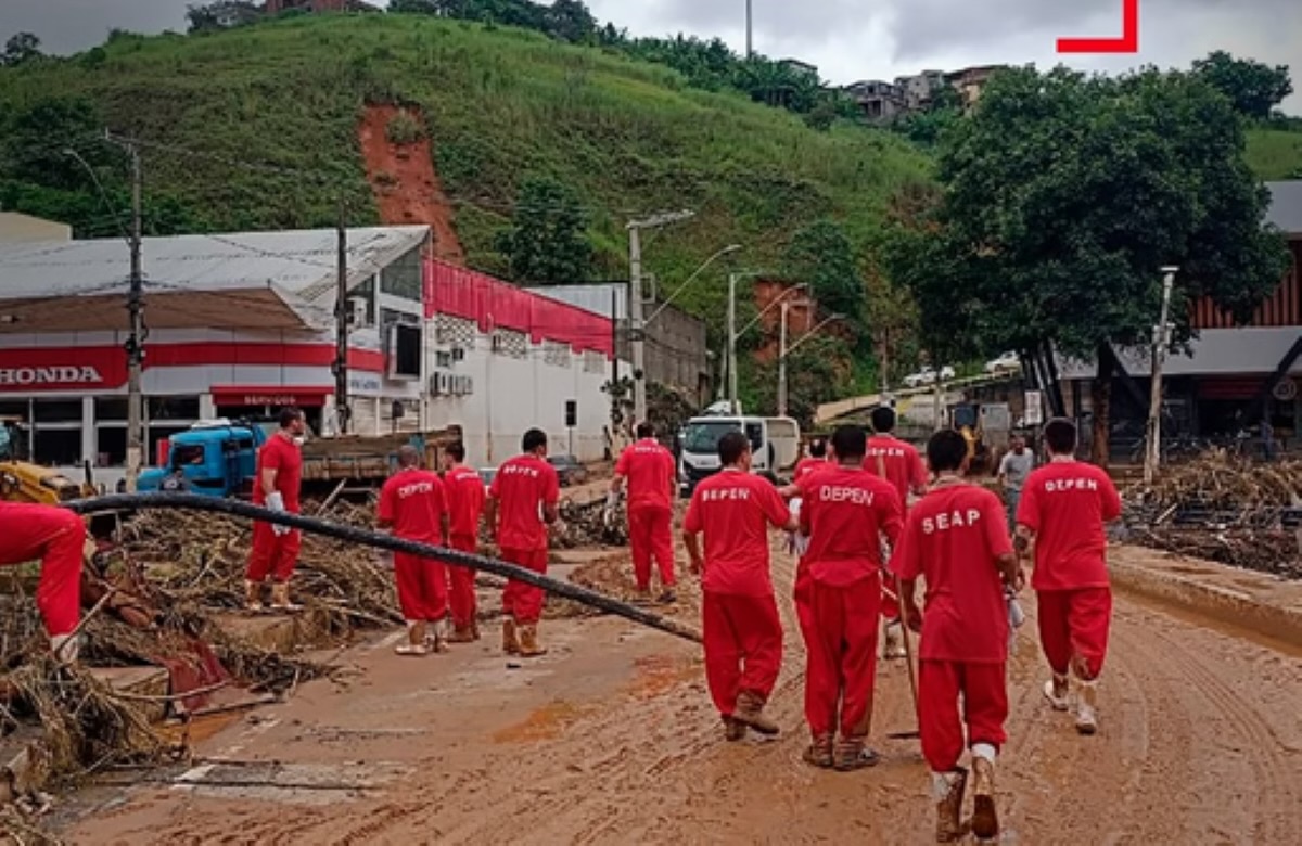 Detentos trabalham na limpeza de ruas após chuvas deixarem rastro de destruição em Minas Gerais