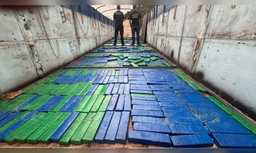 Durante a inspeção, foi identificado um desnível no piso da carreta, revelando um fundo falso onde estavam escondidas as drogas.