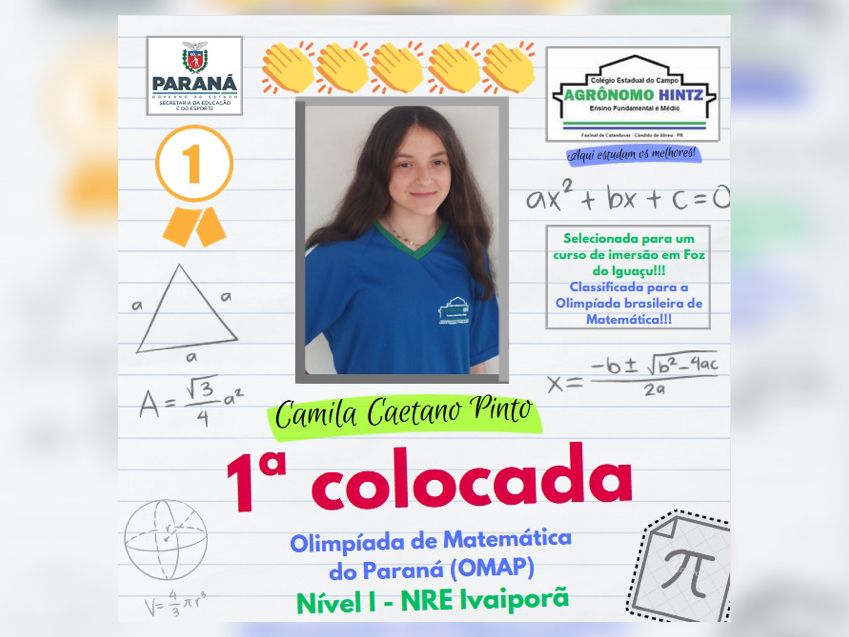 A estudante do Colégio Estadual do Campo Agrônomo Hintz de Cândido de Abreu, Camila Caetano Pinto, do 6º ano, alcançou o primeiro lugar na Olimpíada de Matemática do Paraná, dentre os quase 2 mil alunos de 6º e 7º anos do Núcleo Regional de Educação (NRE) de Ivaiporã.