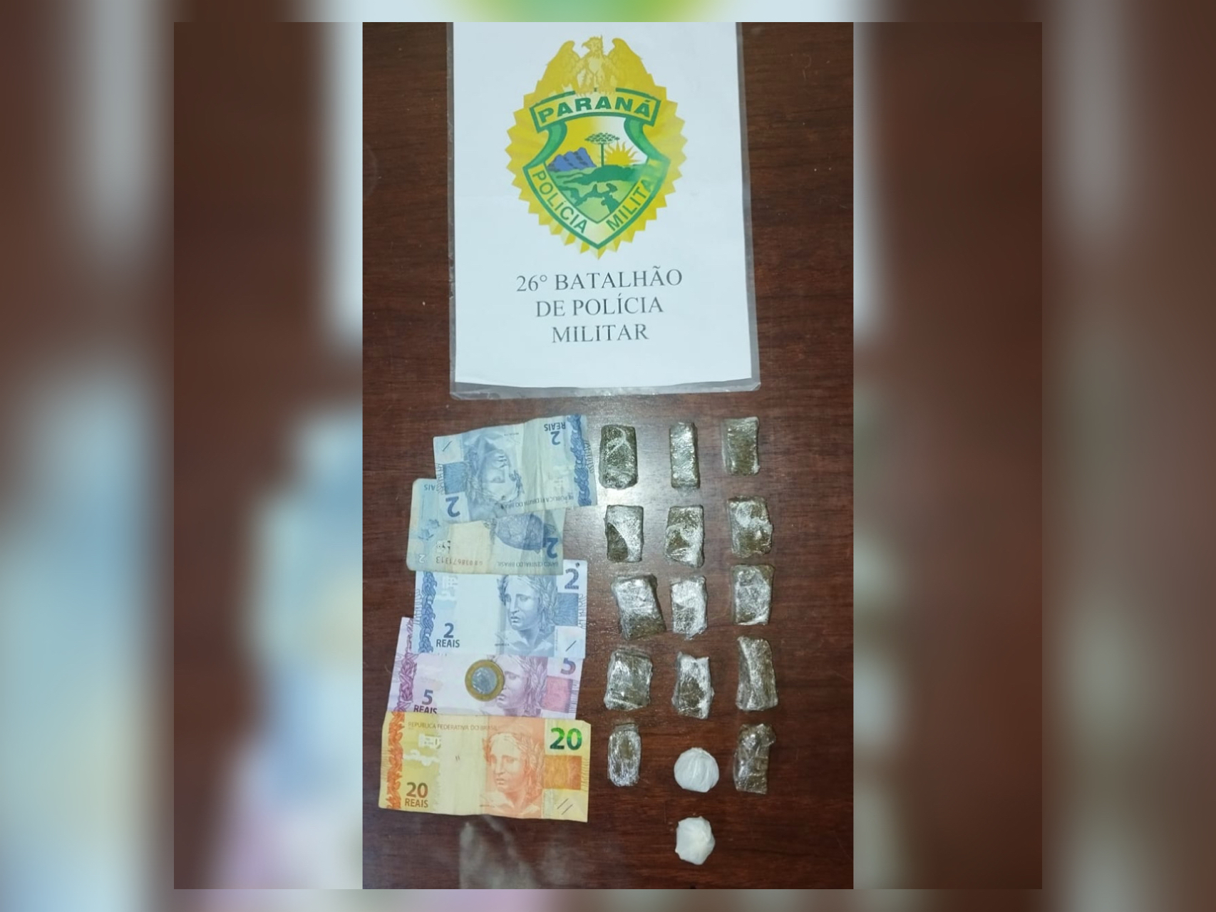 Ao fazer a abordagem dos homens, a PM encontrou com um deles, que já é conhecido do meio policial, 16 porções embaladas de maconha e R$ 32.