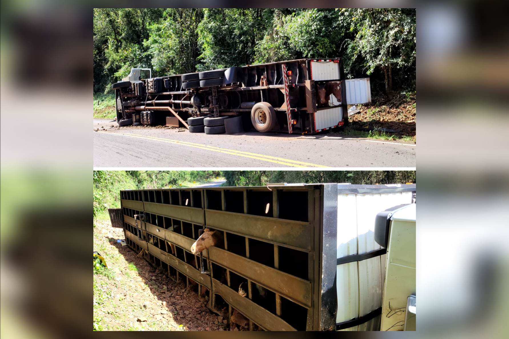 Caminhão carregado com cavalos tomba na “Curva do Tijolo” entre Manoel Ribas e Nova Tebas