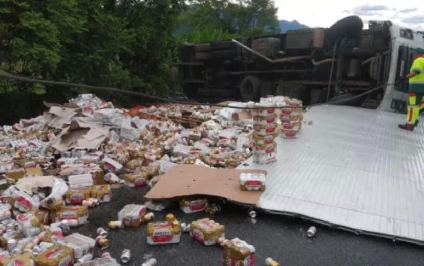Um caminhão carregado de engradados de cerveja tombou na tarde desta sexta-feira (17) na BR-277, no sentido litoral, próximo a entrada de Morretes. Uma faixa da rodovia está liberada.