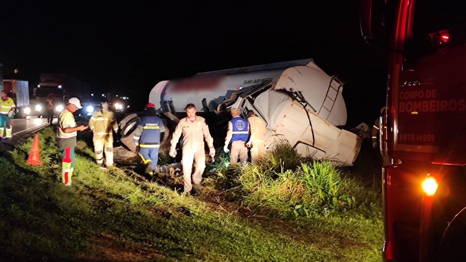 O caminhão-tanque (com placas de Ponta Grossa), carregado com óleo vegetal, bateu em um barranco e tombou no canteiro. Com o impacto, a cabine ficou destruída.