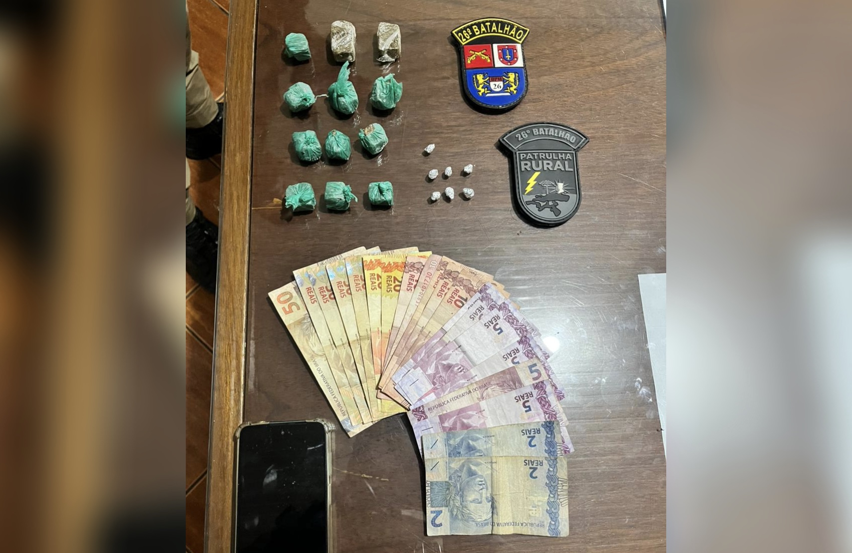 Os policiais encontraram mais porções de drogas, dinheiro em espécie e materiais associados ao tráfico. A Patrulha Rural também auxiliou nos trabalhos.