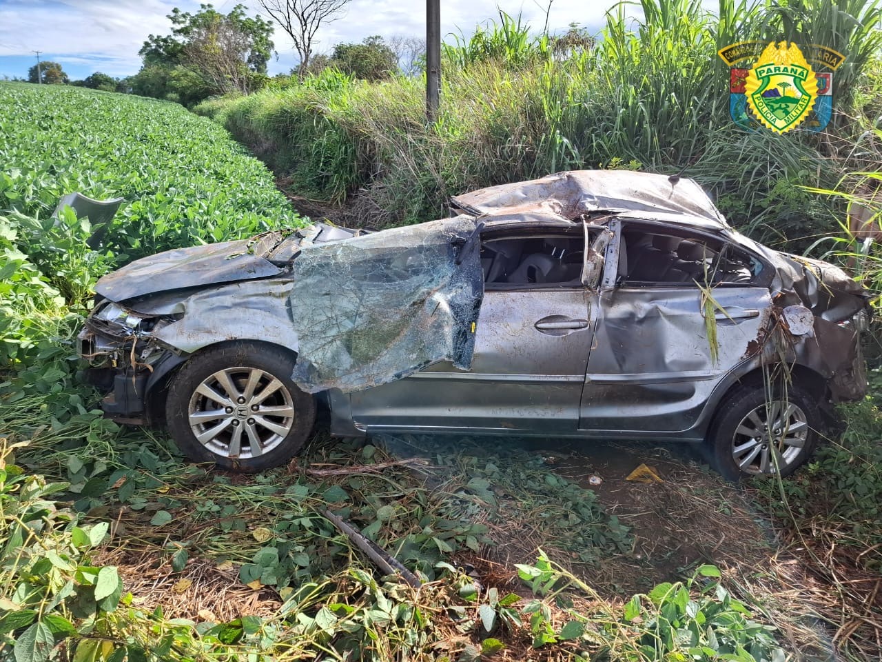 Conforme a Polícia Rodoviária Estadual (PRE), o condutor de um Honda/Civic (com placas de Ivaiporã) perdeu o controle, saiu da pista e capotou em uma plantação de soja.