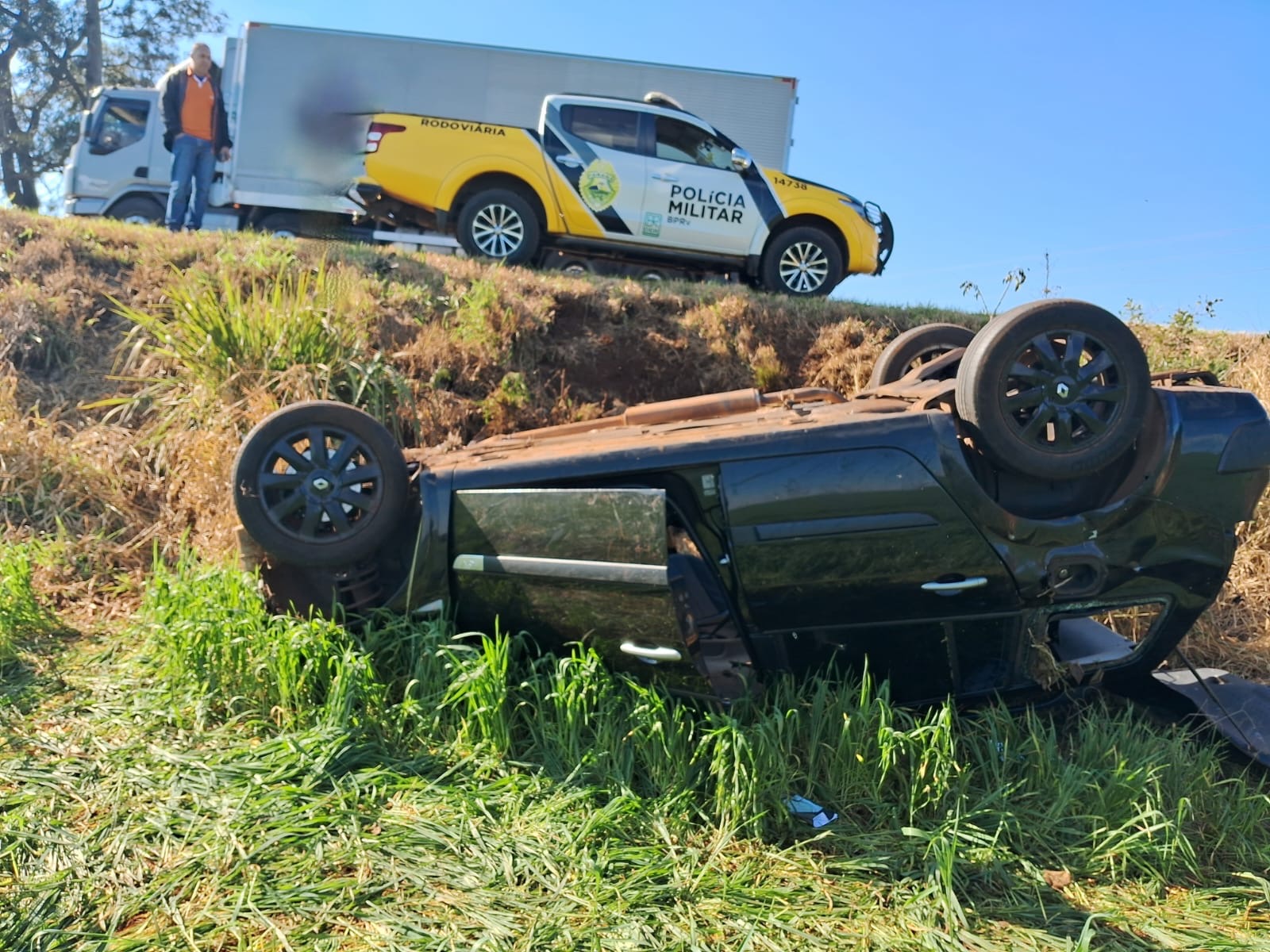 O condutor de um Renault/Megane (com placas de Ivaiporã) perdeu controle do veículo, saiu da pista e capotou em um barranco, próximo a Vila União, segundo a Polícia Rodoviária Estadual (PRE).