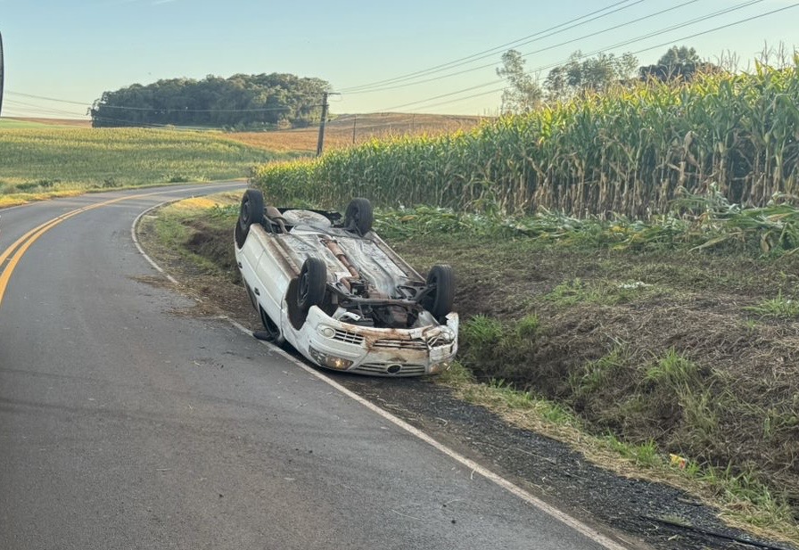 O condutor de um Volkswagen/Gol perdeu o controle do veículo e capotou na pista, próximo a entrada da 5 Encruzilhadas.