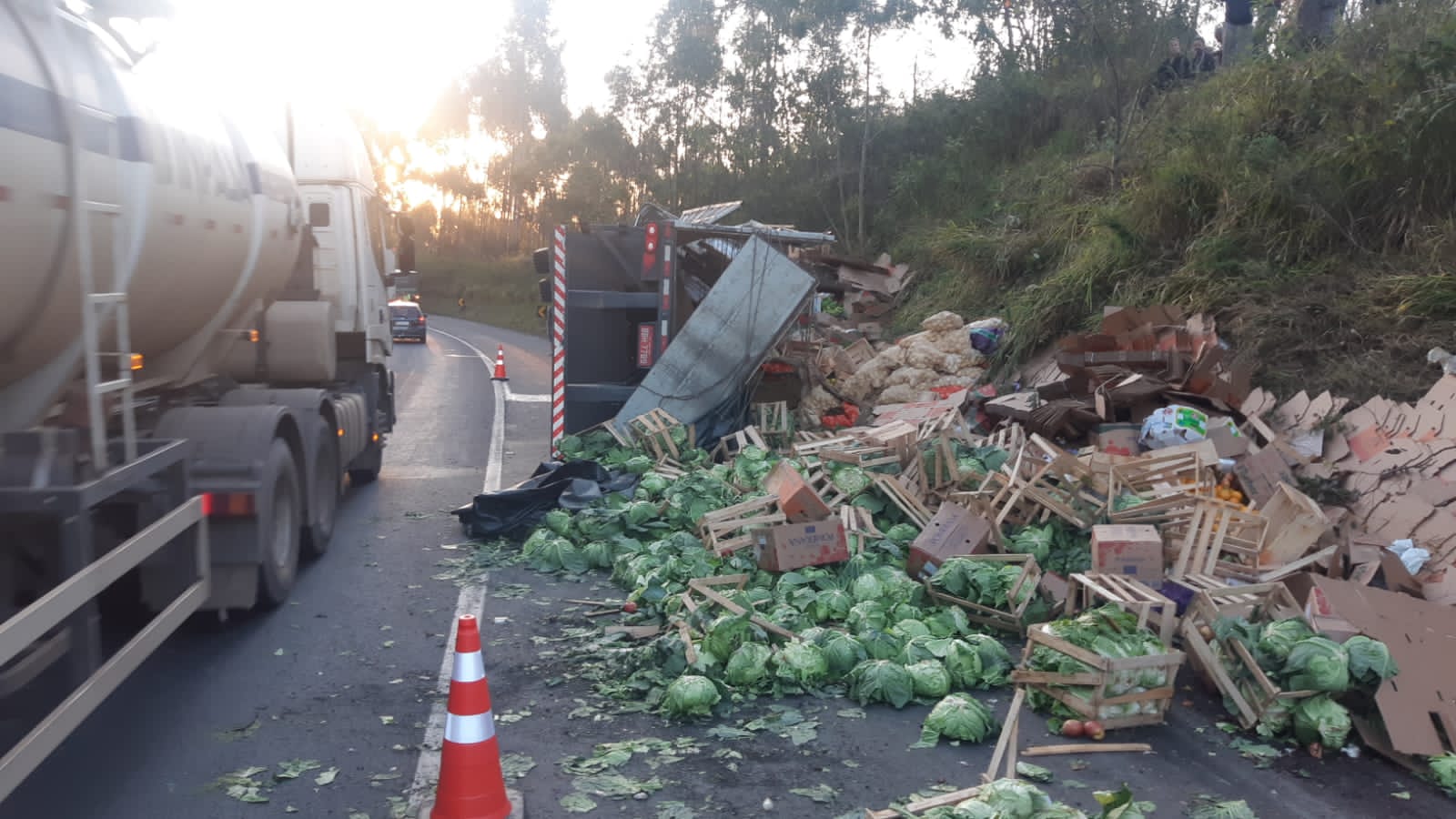 A carga de hortifruti ficou espalhada no acostamento e sobre o barranco, até ser quase totalmente saqueada.