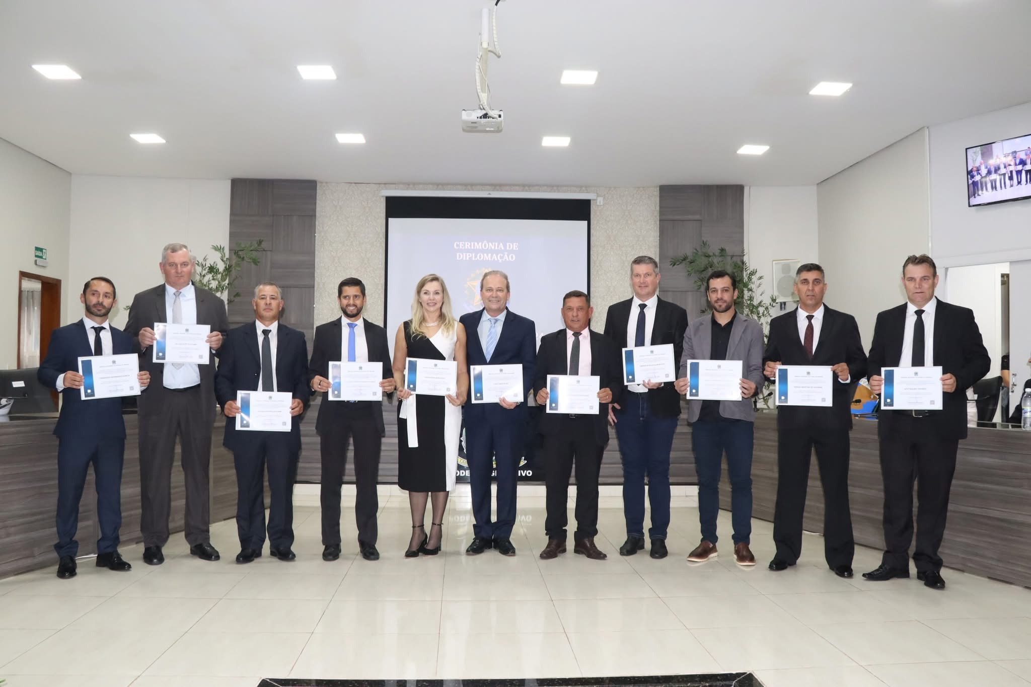 Durante a cerimônia, os vereadores eleitos receberam os diplomas: Ilson Gagliano, Alex Fonseca, Emerson Bertotti, Levi Shuindt, Valdeci Dias (Careca), Ailton Stipp, Nando Dorta, Sérgio Oliveira e Rodrigo Cordeiro.
