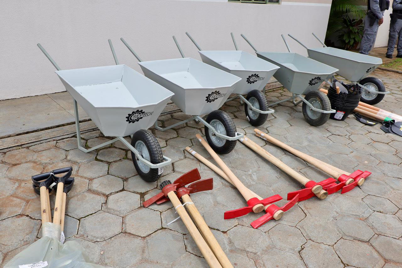 Além dos carrinhos de mão, os apenados também receberam picaretas, enxadas e pás, além de uniformes específicos para facilitar a identificação, com a inscrição “Missão Rio Bonito do Iguaçu”, também produzidos pelo sistema penitenciário do Estado.