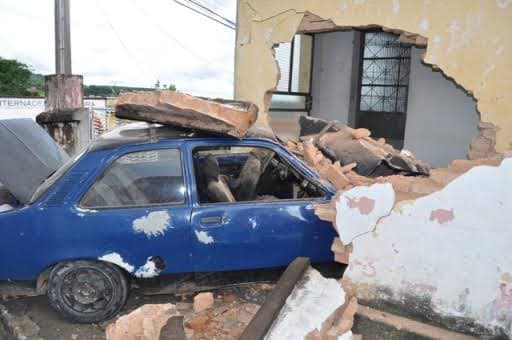 A parede acabou caindo em cima de um adolescente (15 anos), sendo que o menino fraturou a perna direita e foi levado ao Posto de Saúde.