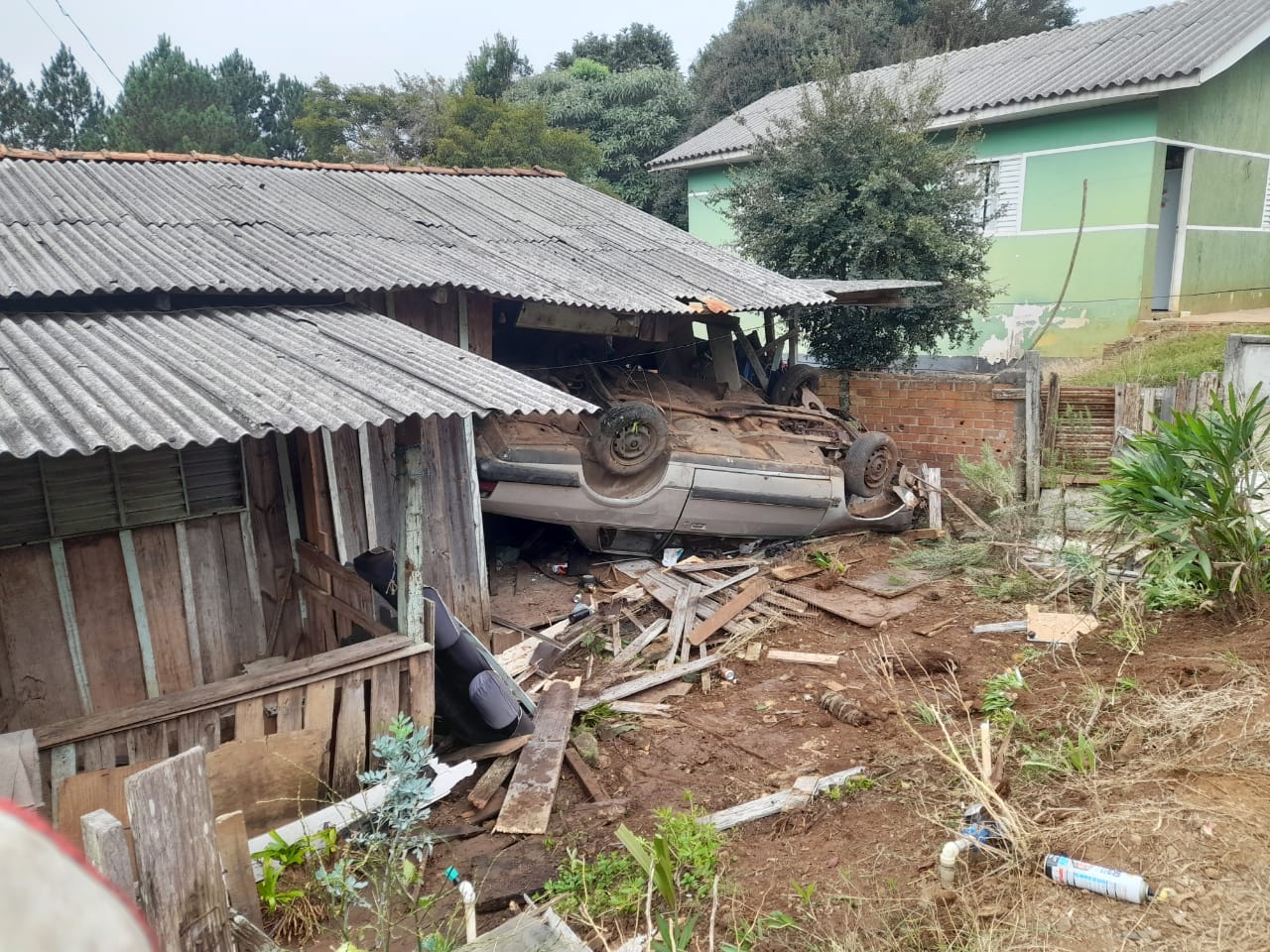 Ao chegar no local, a equipe constatou que um carro Ford/Del Rey havia capotado e colidido contra uma residência.