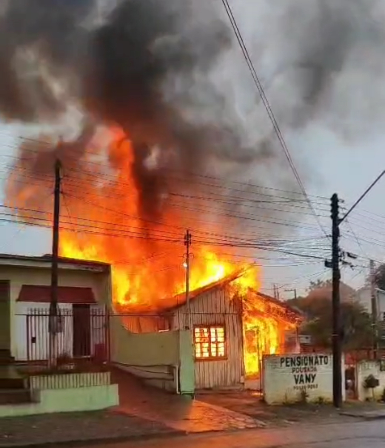 Um incêndio de grandes proporções destruiu uma casa de madeira na manhã desta quarta-feira (29), por volta das 7h, no bairro Alto da XV, em Guarapuava.