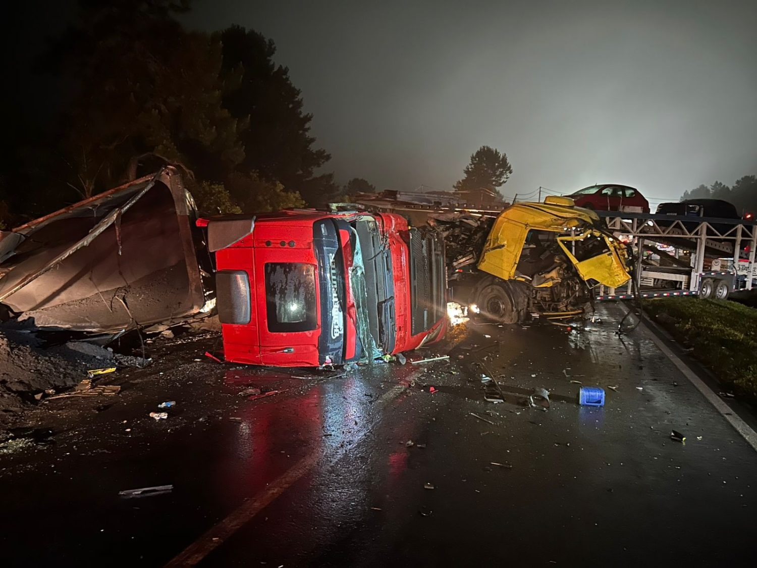 Segundo informações da Polícia Rodoviária Federal (PRF), o motorista de um caminhão Scania perdeu o controle do veículo, passou pelo canteiro central e acertou um caminhão-cegonha que vinha no outro sentido.