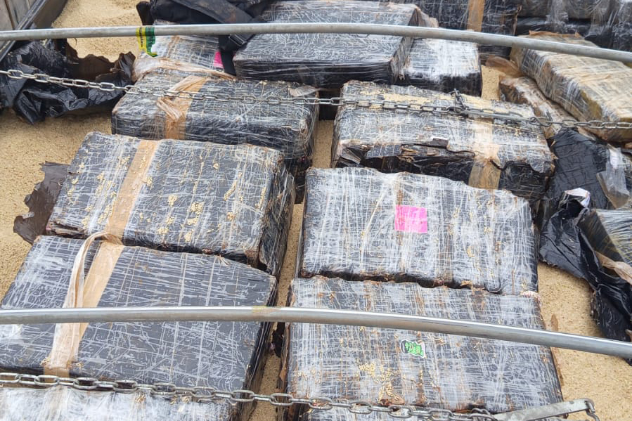 As equipes policiais trabalharam ao longo de toda a manhã no descarregamento da droga para realizar a pesagem oficial e determinar o volume exato da apreensão.
