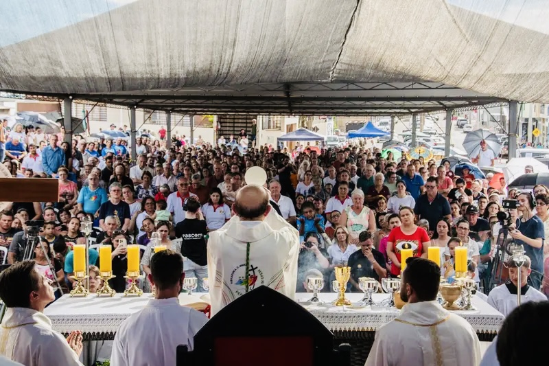 A peregrinação teve seu ponto culminante em frente à igreja, com a celebração da Santa Missa campal. Durante a homilia, Dom Amilton explicou o sentido da elevação da paróquia à condição de santuário. “Para o encerramento deste Ano Jubilar da Esperança, em alguns lugares os bispos mudaram o local para afirmar uma realidade para sempre. Por isso, nesta Igreja Particular de Guarapuava, nos deslocamos para dizer que aqui, em Rio Bonito do Iguaçu, se um dia ficou marcado de forma tão dolorosa, para sempre será marcado com este espaço”, afirmou.