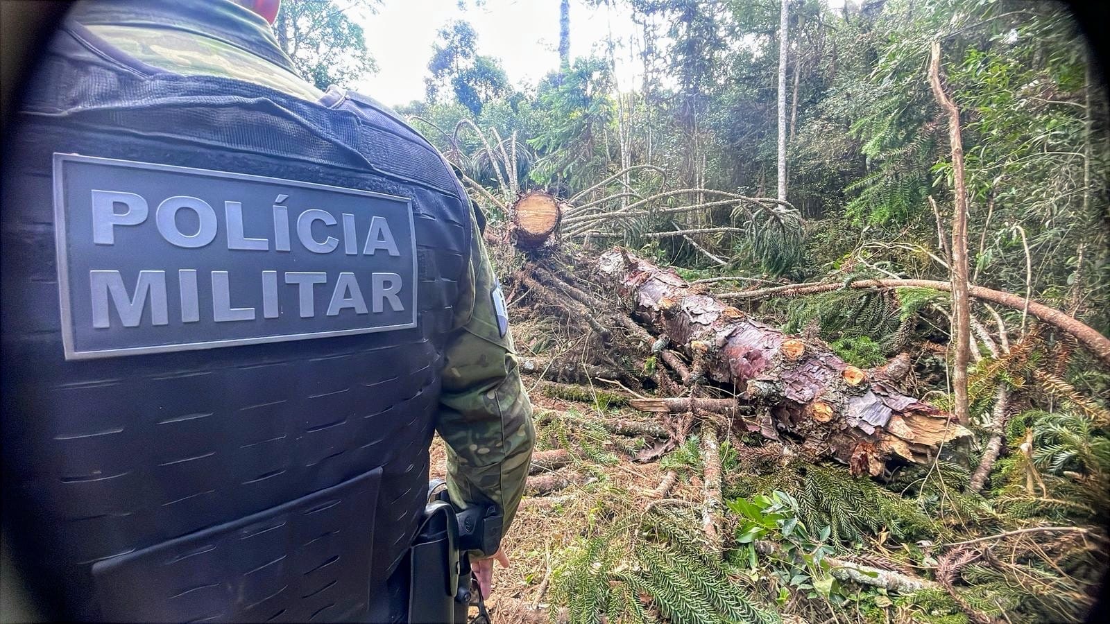 Durante a ação, foram identificados 10 pinheiros cortados sem autorização, totalizando 24 toras, evidenciando o desrespeito às normas ambientais e o risco à biodiversidade local.