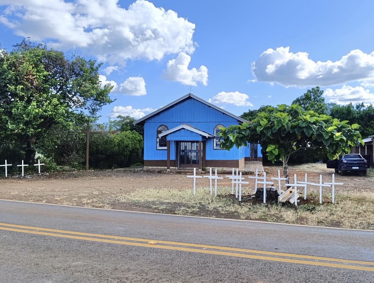 Quem passa pela rodovia PR 848, em Ariranha do Ivaí, consegue ver cruzes em frente a igreja da comunidade Jardim da Curva.