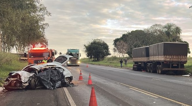 A colisão frontal envolveu um carro Chevrolet/Celta (com placas de Querência do Norte) e uma carreta (com placas de Mandaguari), segundo a Polícia Rodoviária Federal (PRF).