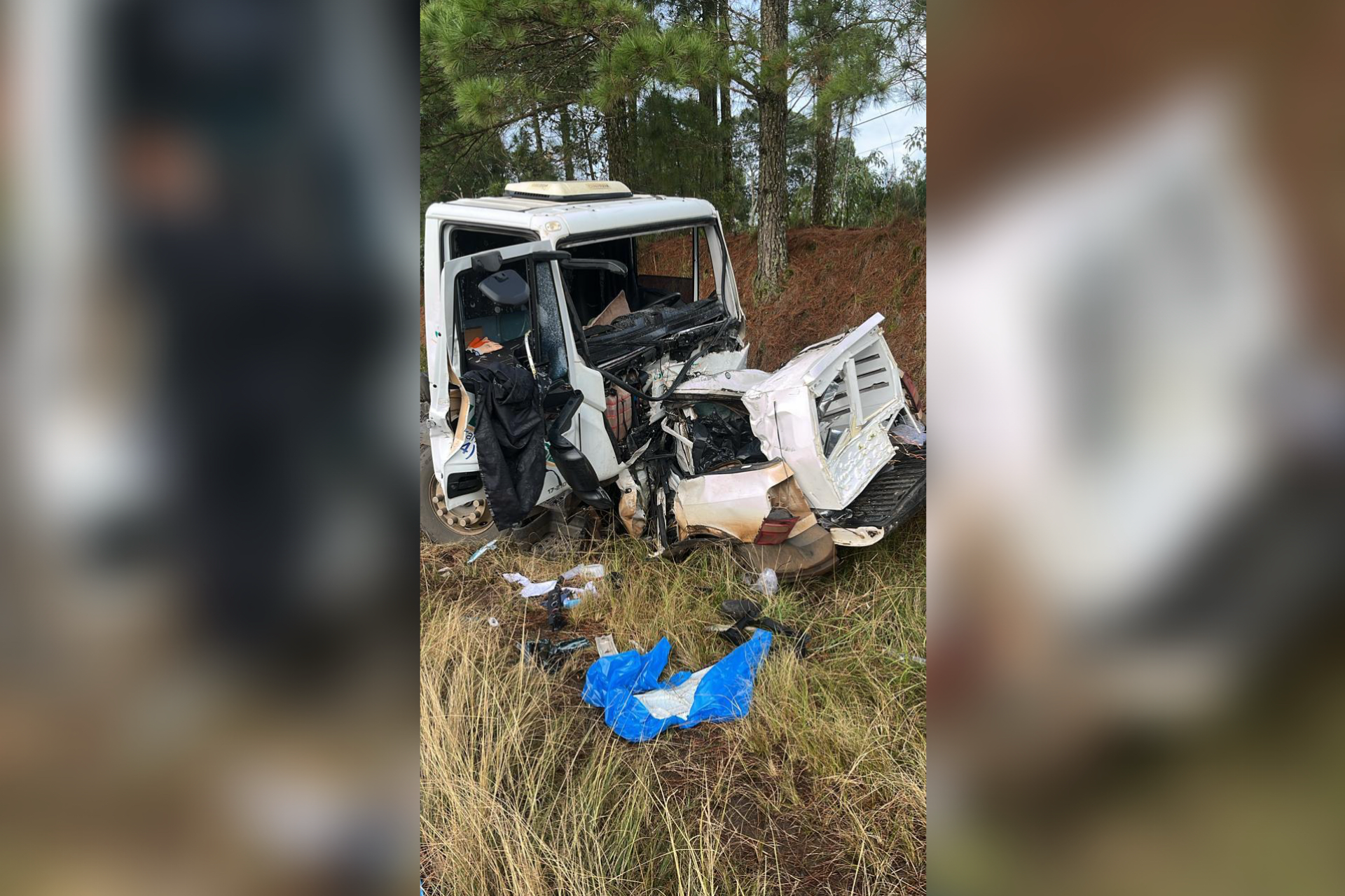 A colisão frontal envolveu um caminhão Iveco/Tector (com placas de Umuarama) e um Volkswagen/Saveiro (com placas de Trinta/SC) no trecho Pinhão a Bituruna.