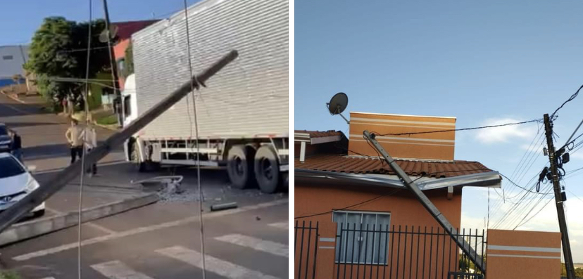 Segundo populares, o veículo estava passando pelo local, enroscou em alguns cabos e fez com que três postes caíssem, dois na rua e um atingiu uma casa.