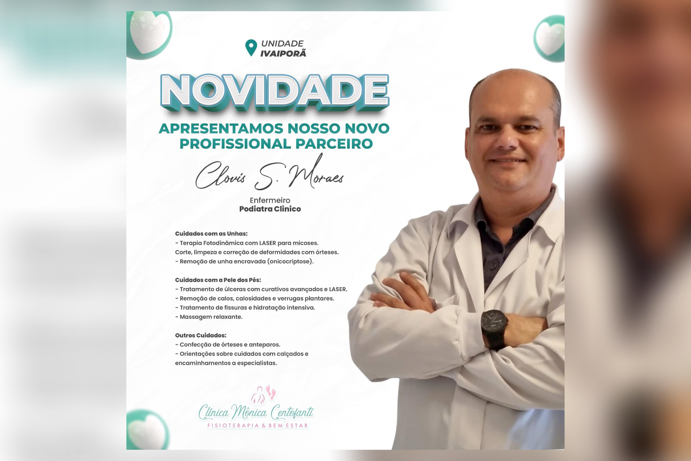 Clovis está atendendo na Clínica Mônica Centofantti, em Ivaiporã e em seu próprio consultório, SOS Saúde dos Pés, em Manoel Ribas, localizado na Rua 7 de Setembro, número 1501, anexo a Floricultura Morada do Sol.