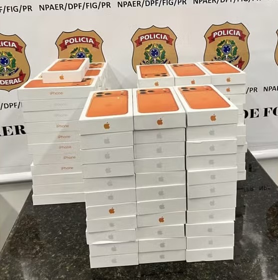 Durante a inspeção, foram encontrados cerca de 100 celulares da marca Apple, modelo iPhone 17 Pro Max, todos sem comprovação de origem legal.