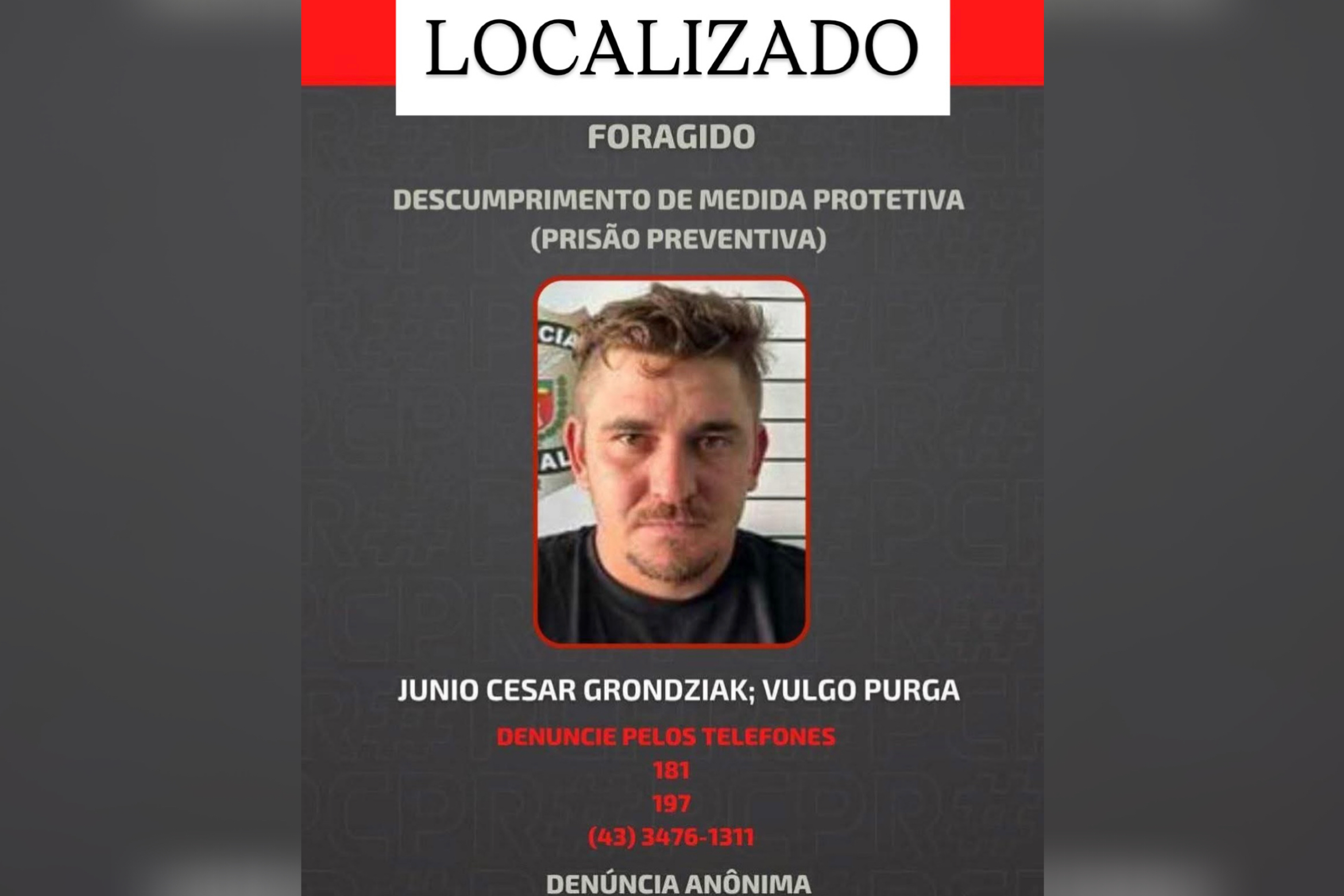 Conforme a PC ao NH Notícias, Junio Cesar Grondziak, conhecido popularmente como Purga, que estava sendo procurado desde o último dia 23, foi visto em uma residência na área central da cidade.