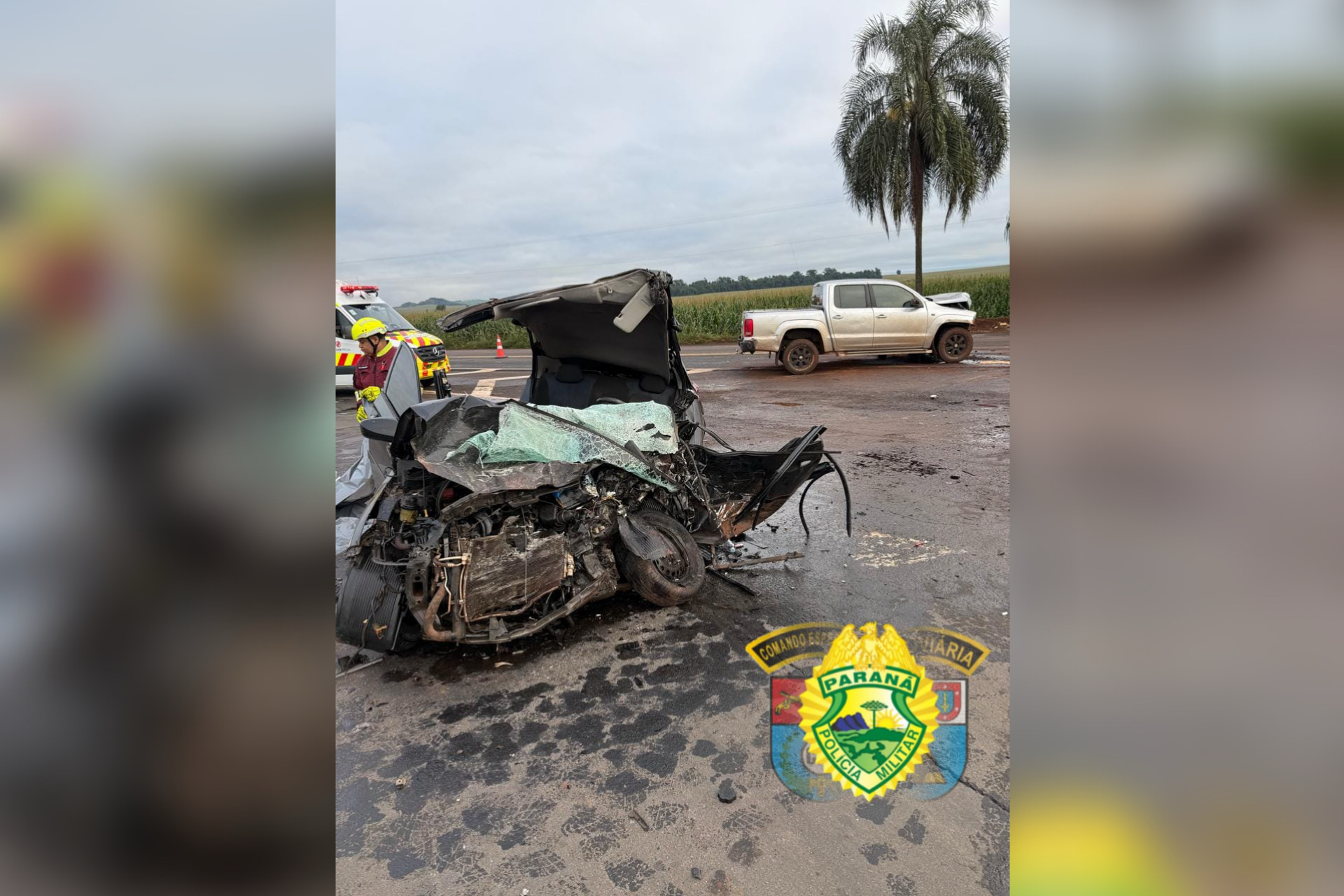 A colisão frontal envolveu uma camionete Volkswagen/Amarok (com placas de Primeiro de Maio) e um Hyundai/HB20 1.6 (com placas de Foz do Iguaçu), segundo a Polícia Rodoviária Estadual (PRE).