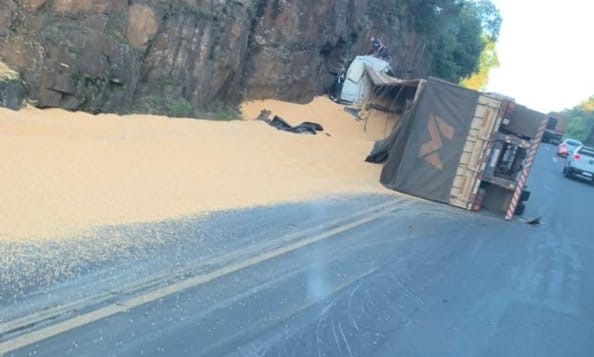 Conforme a Polícia Rodoviária Federal (PRF), o motorista de um caminhão Volvo (com placas de São Miguel do Guaporé/RO), carregado de milho, perdeu o controle do veículo, invadiu a pista contrária e colidiu contra um paredão de rochas.