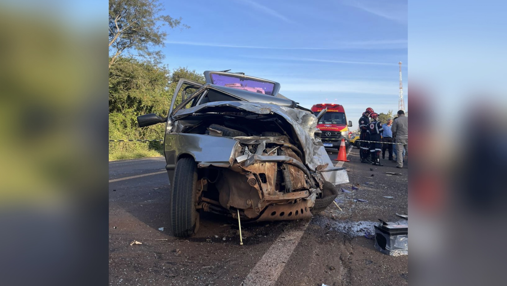 A colisão frontal envolveu um Fiat/Palio e um caminhão carregado de toras de madeira. O condutor (75 anos) do carro não resistiu aos ferimentos e morreu no local.
