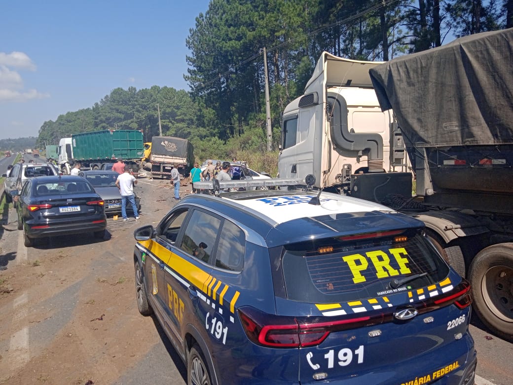 Conforme a Polícia Rodoviária Federal (PRF), o engavetamento envolveu 10 veículos, sendo quatro caminhões e seis automóveis.