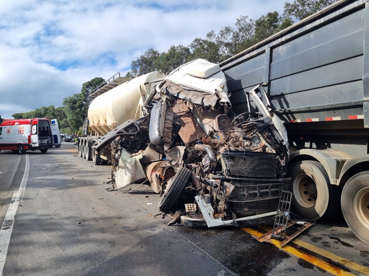 As colisões frontal e lateral envolveu cinco veículos, sendo um Honda/Fit (com placas de Chapecó/SC), um caminhão Mercedes-Benz (com placas de Guarapari/ES), um caminhão Volvo (com placas de Cascavel/PR), um caminhão Volkswagen (com placas de Pinhão/PR) e um ônibus da empresa Nordeste com 23 passageiros.
