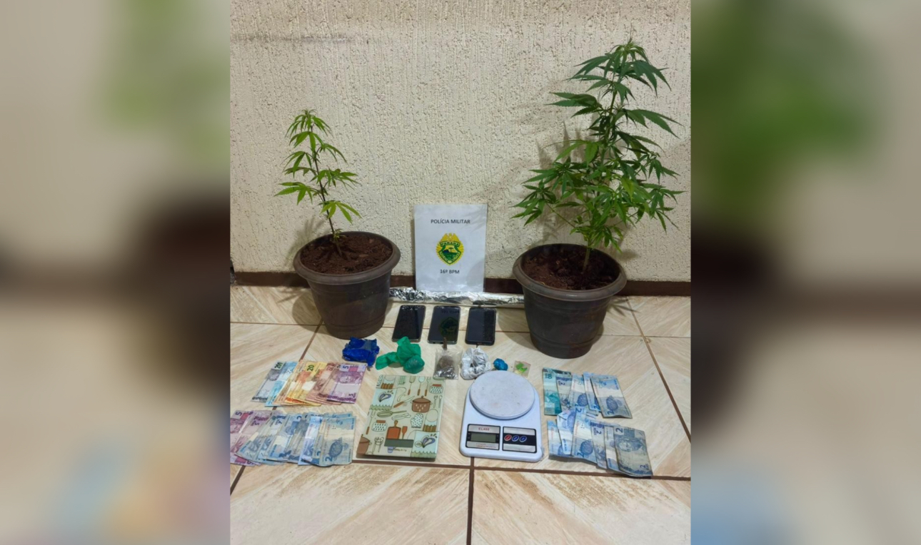 Durante as buscas e apreensões na residência do autor, também foi encontrado dois pés de maconha plantados em dois vasos próxima a porta de entrada da residência. No quarto do casal, ainda foi localizado duas porções de maconha.