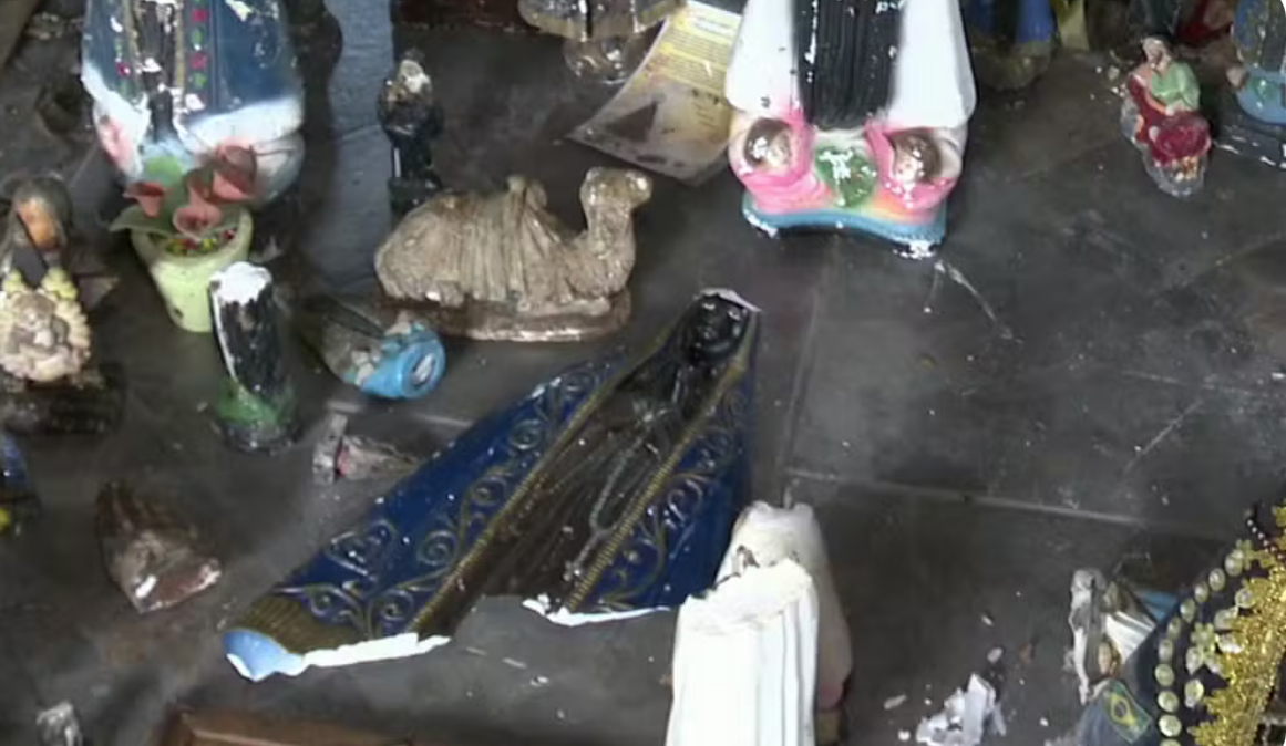 Fiéis encontraram no local as imagens quebradas e jogadas no chão, principalmente imagens de Nossa Senhora.