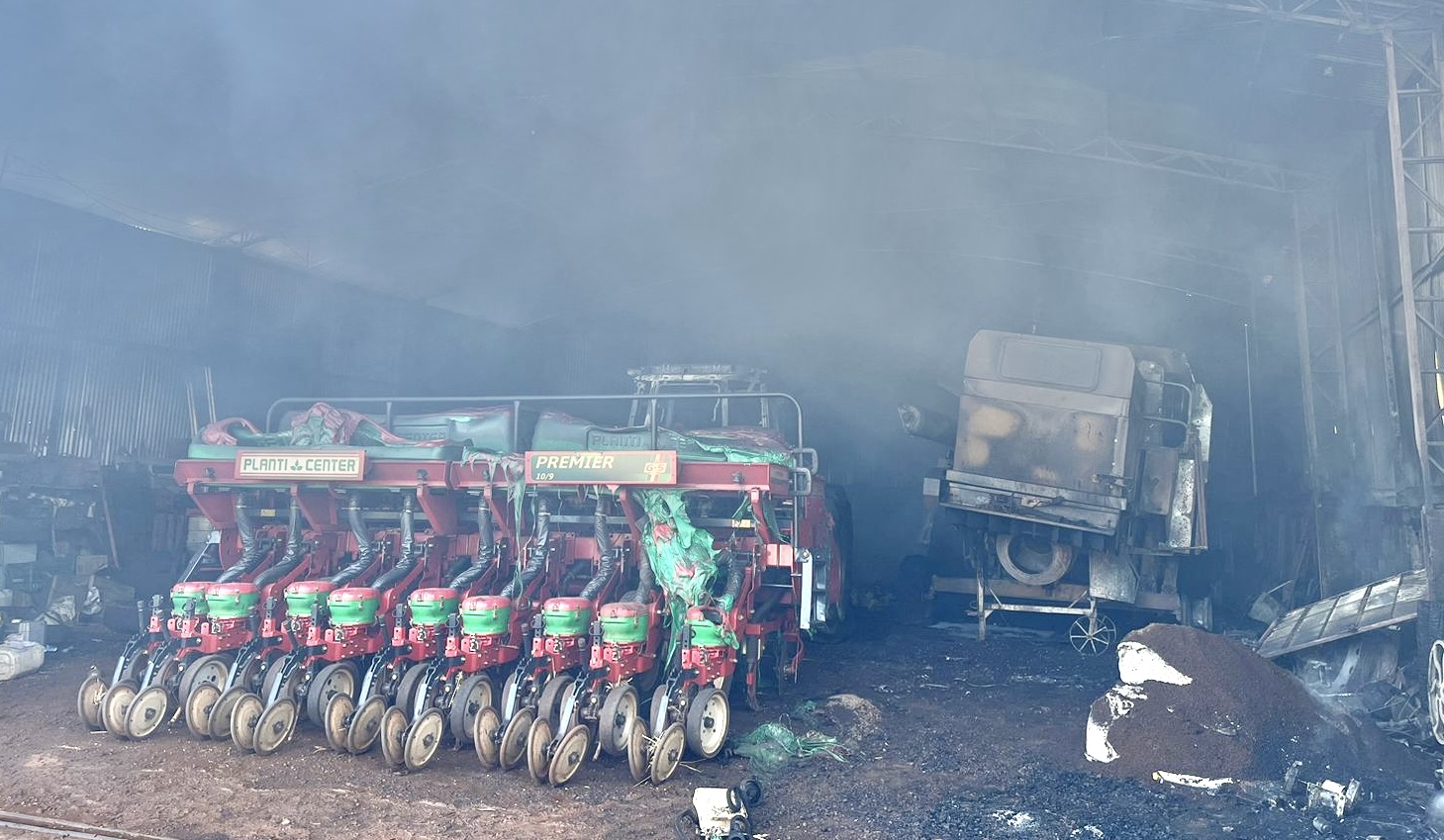 O fogo atingiu vários maquinários agrícolas que estavam guardados no local. A propriedade fica no interior do município.
