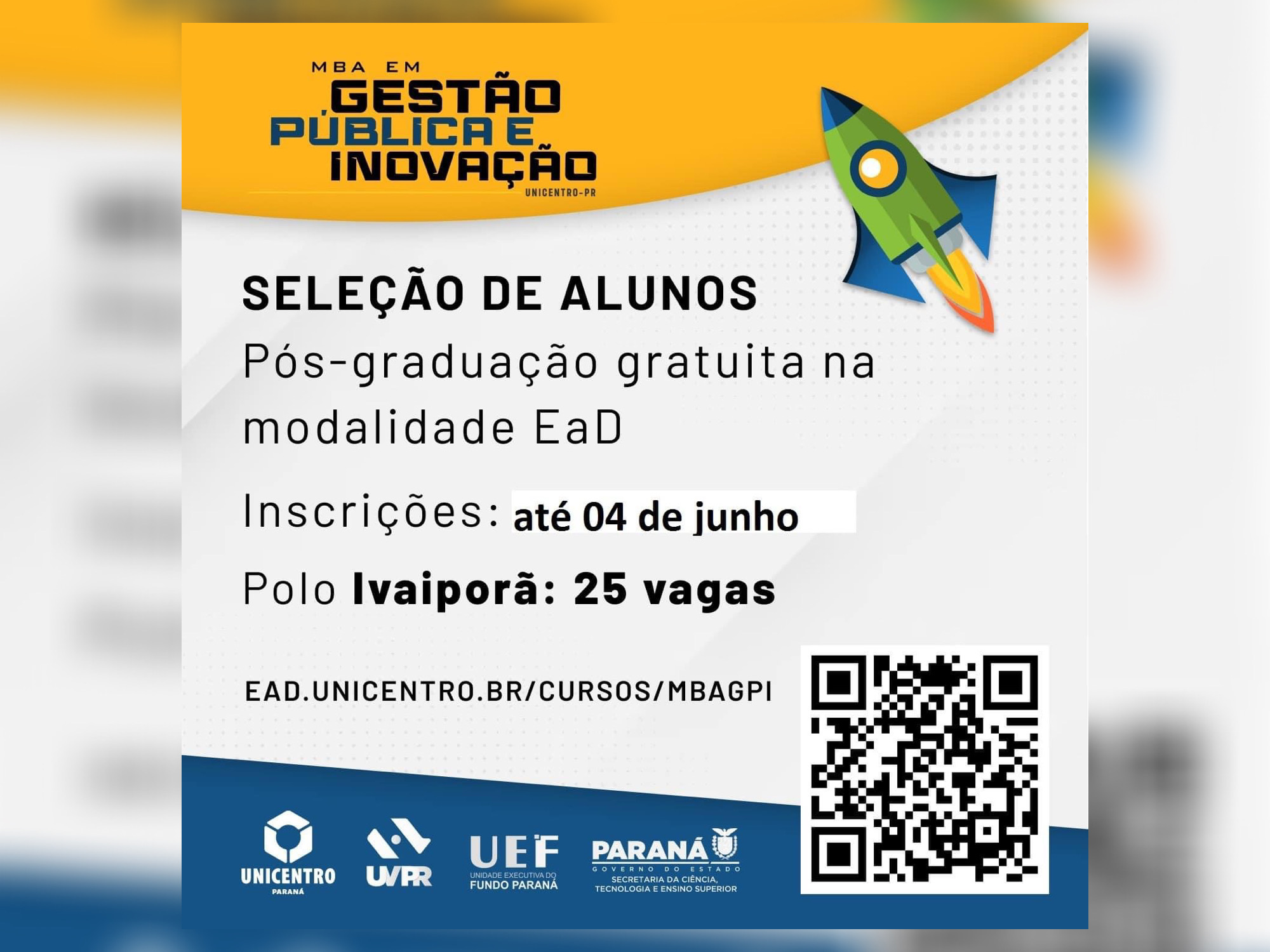Estão abertas as inscrições para o MBA em Gestão pública e Inovação na modalidade EaD da Unicentro.