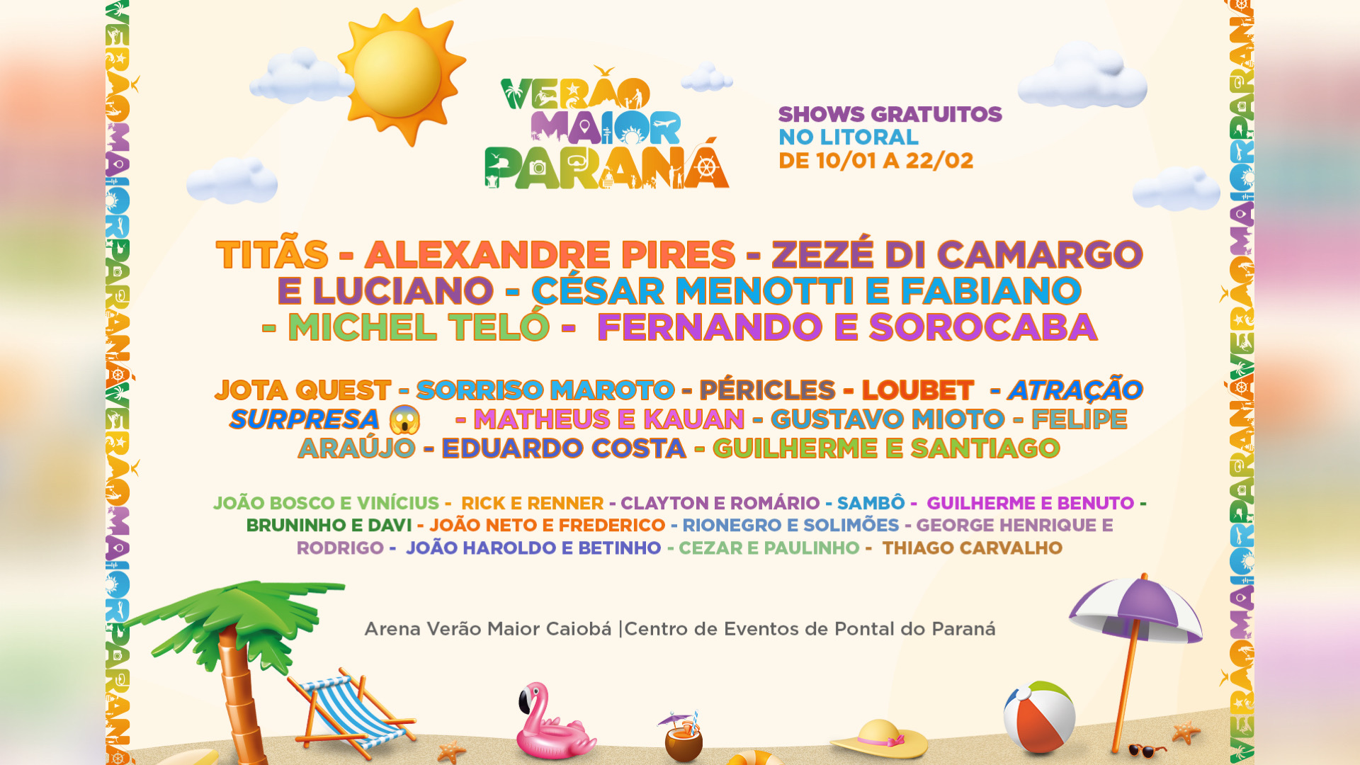 O Verão Maior Paraná 2024/2025 do Governo do Estado promoverá 33 shows gratuitos nas arenas de Matinhos e Pontal do Paraná entre janeiro e fevereiro. Serão sete finais de semana seguidos com programação musical e grandes nomes da cultura popular brasileira nas praias paranaenses, de 10 de janeiro a 22 de fevereiro. A expectativa é de reunir um público superior ao da última edição, que atraiu mais de 1 milhão de turistas, inclusive com um show com mais de 150 mil pessoas, ou quase dois Maracanãs lotados.