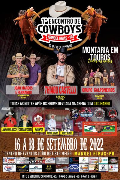 O 1° Encontro de Cowboys tem entrada gratuita e montaria de touros todas as noites, com início a partir das 21h. O evento terá shows de vários cantores e “revoada”, após as apresentações musicais, com o DJ Djhango.