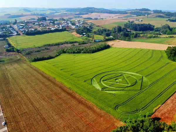 Uma figura misteriosa apareceu em uma plantação de trigo em Ipuaçu, no Oeste catarinense. A imagem foi encontrada na manhã desta terça-feira (4). Sérgio Girotto, 62 anos, estava tomando café quando recebeu mensagens avisando sobre o desenho visto na propriedade.
