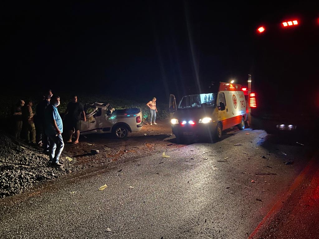 No momento do acidente chovia no local. Com a colisão, o carro saiu da pista e a carreta entrou a plantação de soja, vindo a pegar fogo.