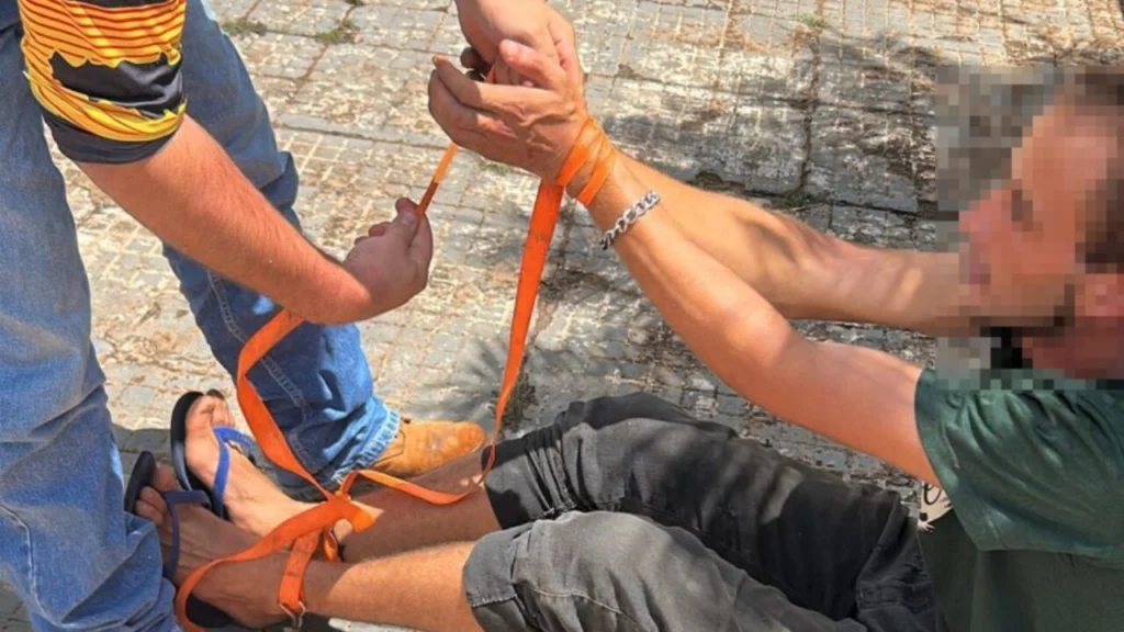 Imagens divulgadas nas redes sociais mostram o momento em que o suspeito tem as mãos e os pés amarrados e é mantido no chão até ser colocado no camburão da viatura.