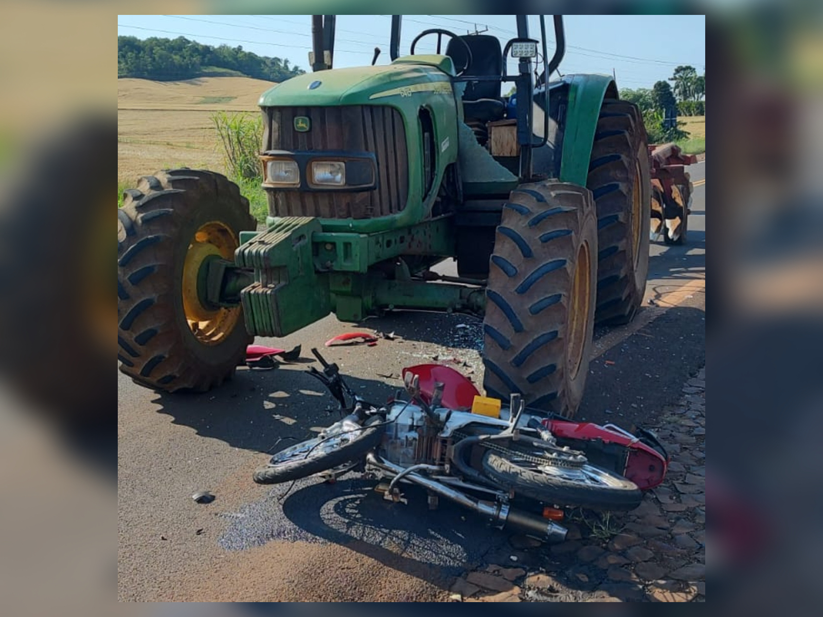 O motociclista e o condutor do trator seguiam em sentidos opostos, quando o motorista da máquina agrícola tentou acessar uma estrada rural e houve a colisão.