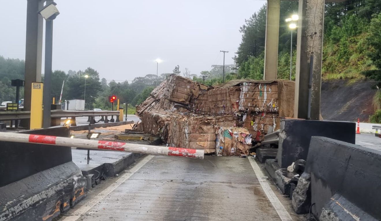 Motorista erra cancela e tomba caminhão em praça de pedágio no Paraná