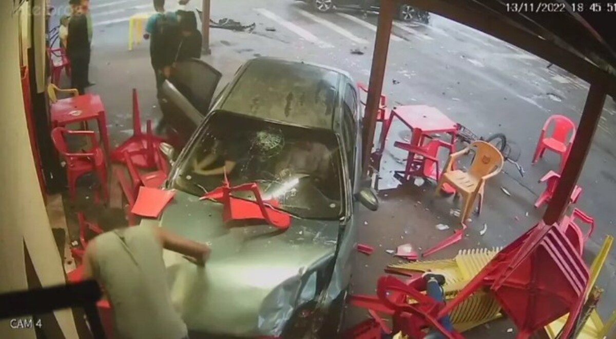 A câmera de segurança do local registrou o momento em que o condutor atravessou a preferencial e atingiu as pessoas na área externa do estabelecimento. Antes de invadir o bar, o Honda Civic bateu em outro veículo no cruzamento.
