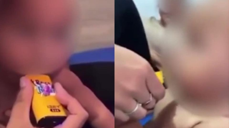 No registro, a tia do bebê (11 meses) pergunta: “Quer experimentar?” enquanto segurava o vape. Então, a mulher coloca o vape na boca do bebê e deixa até ele tossir e soltar a fumaça.