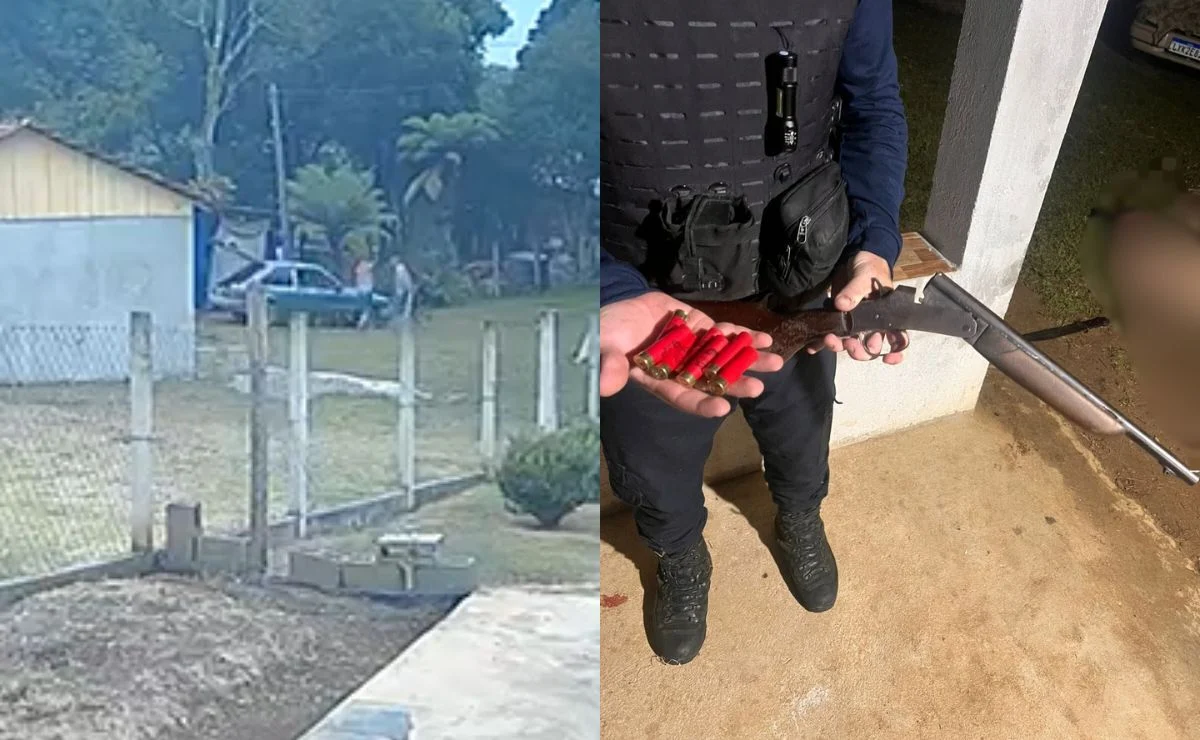 Imagem de câmera de segurança registrou momentos de tensão antes dos disparos. No vídeo, o homem aparece armado com o facão enquanto a outra pessoa tenta se defender com um pedaço de madeira. Instantes depois, é possível ouvir o primeiro tiro, efetuado pela moradora do imóvel.