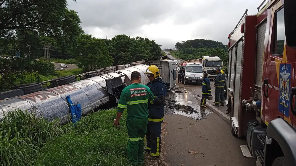 A carga se espalhou por parte do asfalto, mas pelas características da substância, ela se solidifica e não corre pela pista, conforme os bombeiros.