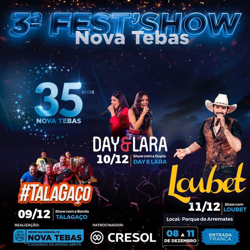 Dia 9, terá show com o grupo Talagaço, dia 10 Day e Lara se apresentam na cidade e dia 11 o cantor Loubet sobe ao palco para se apresentar em Nova Tebas.