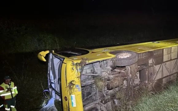Conforme a Polícia Rodoviária Federal (PRF), o condutor de um ônibus perdeu o controle do veículo, que presta serviço a empresa Santa Maria, saiu da pista e tombou.